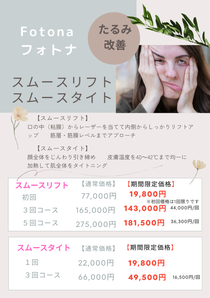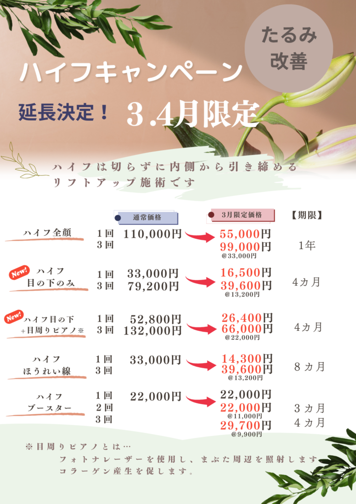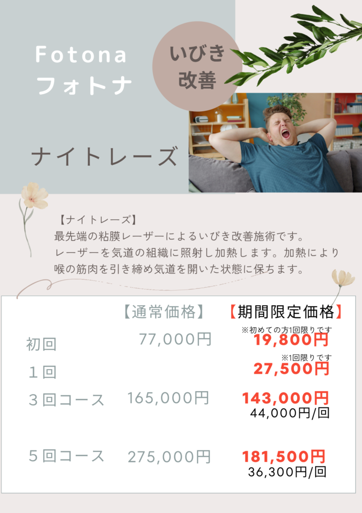 4・5月 期間限定プランのご案内 投稿日 2026年4月3日 今回の期間限定プランは「いびき」「たるみ」が気になる方へおすすめです。いびき改善にはフォトナナイトレーズ、たるみ改善にはフォトナスムースリフト・スムースタイト。お顔のリフトアップにはハイフのメニューをどうぞ。 新生活やイベント前のメンテナンスに是非ご体感ください。 ハイフキャンペーン:3月2日~4月30日まで(4月まで延長決定!) フォトナナイトレーズキャンペーン:4月1日~5月31日 フォトナスムースリフト・フォトナスムースタイトキャンペーン:4月1日~5月31日